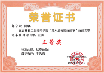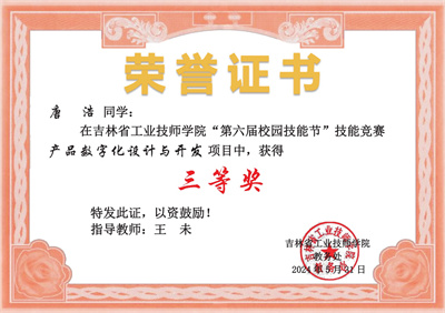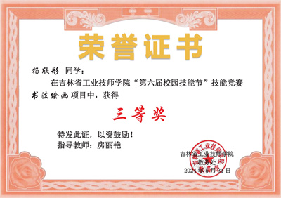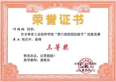 Hi同学们,经过激烈的角逐,裁判员老师的公正评选,工作人员的仔细核对,吉林省工业技师学院第六届校园技能节技能大赛已完美谢幕,快来领取你的获奖证书!